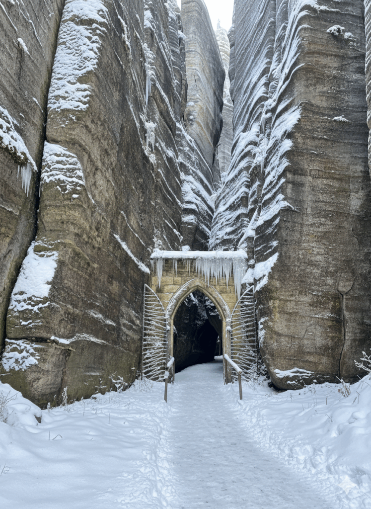 Im Winter verwandelt sich die Adersbacher Felsenstadt in eine stille, zauberhafte Märchenlandschaft und das Gotische Tor bildet dabei ein besonders eindrucksvolles Motiv. Die sonst ockerfarbenen Sandsteinwände der engen Felsenschlucht sind manchmal mit einer Schneedecke überzogen. Das Tor wirkt dann noch romantischer und mystischer. Der Hauptrundweg ist in der Nebensaison geöffnet (mit kürzeren Öffnungszeiten) und der Besucherandrang im Winter ist deutlich geringer. Dies ermöglicht eine besonders friedliche und ungestörte Besichtigung. Wanderer sollten jedoch stets auf festes, rutschfestes Schuhwerk achten, da die verschneiten Stufen und Wege im Felsenlabyrinth sehr glatt sein können. Die Atmosphäre ist durch die Stille und das kontrastreiche Zusammenspiel von weißem Schnee und dunklem Stein einzigartig. Das Gotische Tor hat keinen gesonderten Öffnungszeiten. Du kannst es ganz normal zu den Öffnungszeiten der Adersbacher Felsenstadt besuchen. Solange die Felsenstadt geöffnet hat, hat das Tor offen: