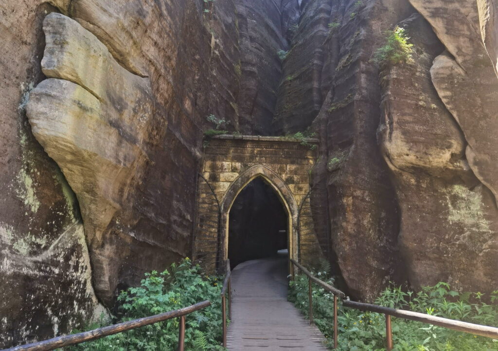 Das Gotische Tor ist das künstlich errichtete Wahrzeichen der Adersbacher Felsenstadt, das im Jahr 1839 im neugotischen Stil erbaut wurde, um den Hauptbereich des Felslabyrinths für Besucher zu erschließen. Als imposantes Steinportal markierte es ursprünglich den offiziellen Eingang ins Innere der Felsenstadt. Es ist strategisch in eine enge Felsgasse eingefügt und dient symbolisch als mystische Schwelle, die Wanderer aus der äußeren Felsenvorstadt in die tiefen Schluchten und zum Langen Gang führt. Das Tor verkörpert die romantische Ästhetik des 19. Jahrhunderts und ist heute ein sehr beliebtes Fotomotiv